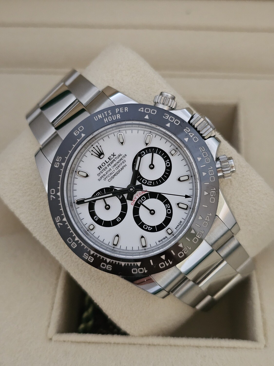 As you can see presented in excellent condition is this highly sort after white dial Rolex Daytona Cosmograph. This modern classic Rolex is the epitome of what Rolex stand for, rugged efficient tool watches that last the test of time. The ceramic Daytona has to be experienced physically to be truly appreciated for it looks and feel on the wrist.