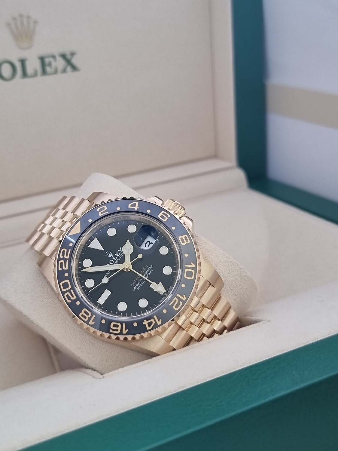 As you can see presented in new and unworn condition is this 2023 Rolex GMT Master II 126718GRNR aka the 'Guinness' still containing factory stickers on the clasp and case.