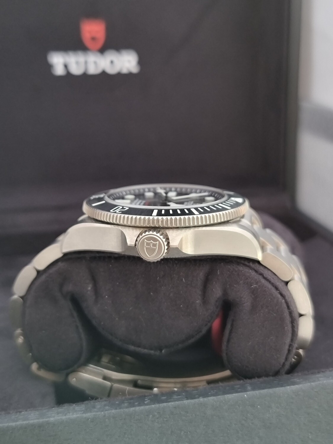 This beautiful Tudor Pelagos 39 with the grade 2 Titanium case and bracelet with Satin finish has to be seen to be really appreciated. The calibre MT5400 is COSC certified is a self winding movement with bidirectional rotor, with a power reserve of 70 hours. The Grade 2 titanium unidirectional rotating bezel with its insert in a Sunray satin finish made of a ceramic and luminous material. The Dial has a Black Sunray satin finish with sandblasted flange and monobloc luminescent ceramic composite hour makers make this a supreme Tudor due to its classic Pelagos look but as a 39mm making it much more versatile.